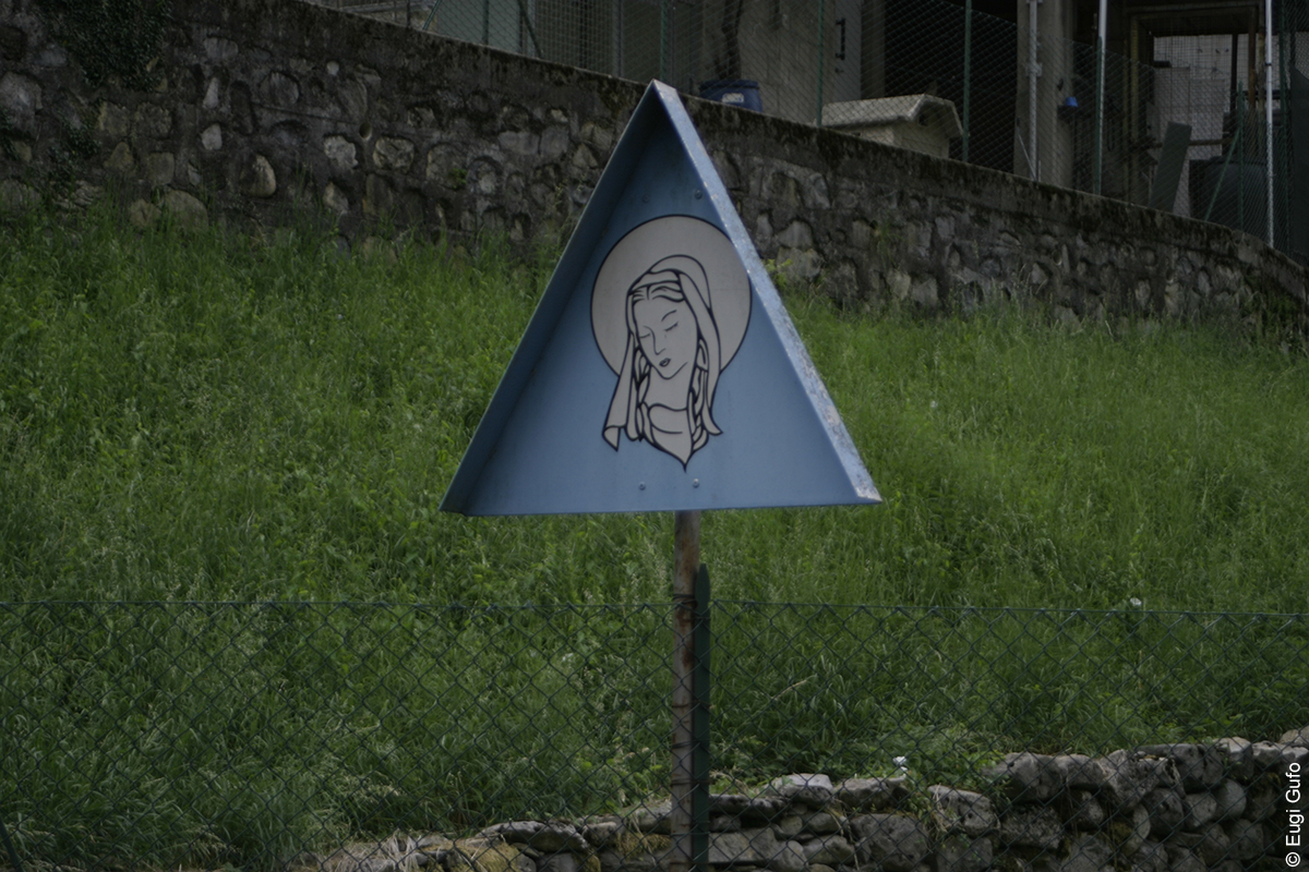 I simboli religiosi si trovano, a Erve, pure in altri contesti. Ecco, per esempio, un cartello stradale che segnala il pericolo delle giovani sante lungo le strade locali. Io, personalmente, non vedo più le giovani sante a bordi delle strade italiane da circa vent’anni: o giro in zone / orari sbagliati, o loro si sono tutte trasferite a Erve. Non indagherò.