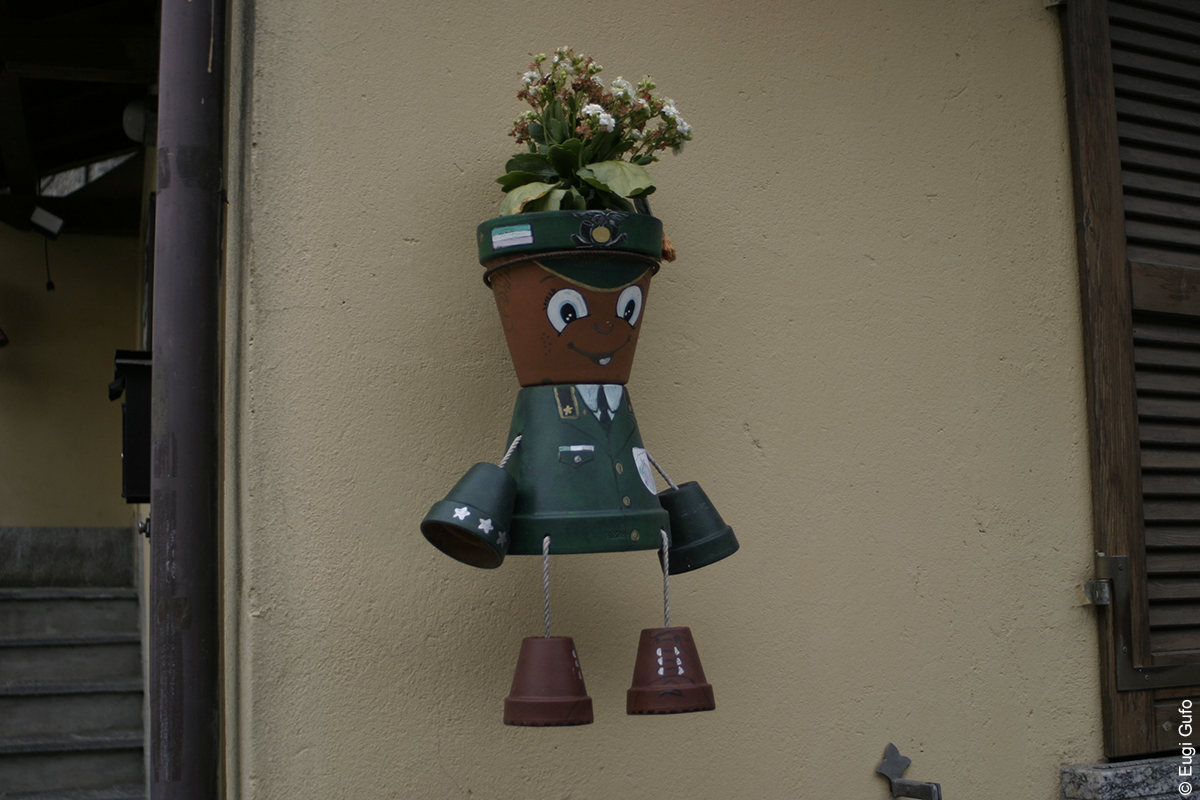 Su tantissimi edifici del paese sono esposte – essendo fissate con varie modalità tecniche – delle strane figure realizzate con i vasi per i fiori domestici e dipinte in modo da sembrare dei personaggi da cartoni animati. Le figure sono quasi tutte di dimensioni e proporzioni uguali, ma a volte capita anche il «formato maxi». In un primo momento ho pensato che fosse solo una invenzione simpatica di qualche artigiano locale, poi ho scoperto che si tratta di un progetto della organizzazione di volontariato «I cocci solidali di Erve» nata nel 2021. Con i fondi raccolti fanno le donazioni a varie organizzazioni o gruppi di persone. Sulla loro pagina di Facebook troverete – se interessati, ovviamente – più informazioni. Io, intanto, mostro solo alcuni dei cocci solidali avvistati in giro per Erve.