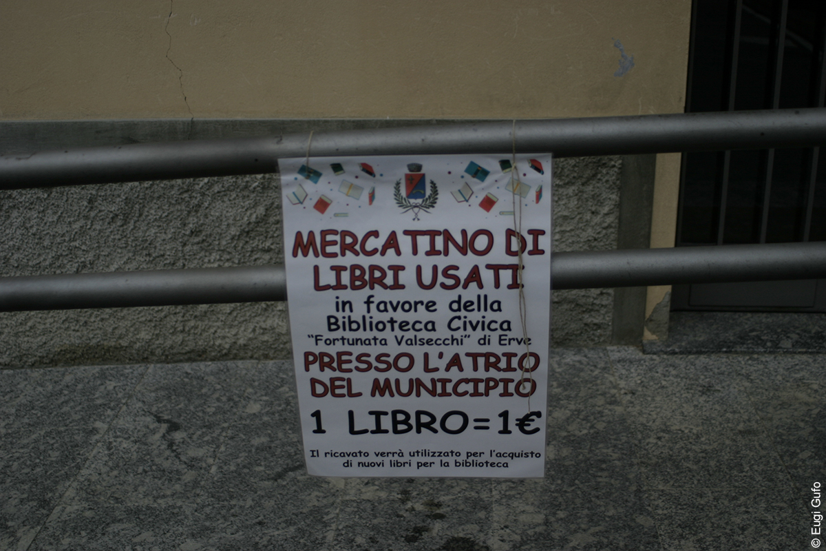 E non è stata l’unica iniziativa interessante che ho visto a Erve. All’interno del Municipio è stato organizzato un mercatino di libri usati: con lo scopo di raccogliere i fondi per l’acquisto di libri nuovi per la biblioteca comunale. La scelta dei libri non era – al momento del mio passaggio in zona – particolarmente ampia e si pagava in contanti (lasciando i soldi in una scatola, 1 euro per libro), ma io ho trovato qualche libro interessante in base ai miei criteri. Non escludo che questa iniziativa possa durare tanto o essere ripetuta anche più volte in futuro: di conseguenza, se vi capita di andare a Erve, controllate pure sul posto. Io ho pensato di avvisarvi anche perché i turisti, solitamente, non prestano l’attenzione agli annunci esposti sugli edifici dei Municipi (e c’è una certa logica in tale comportamento), perdendosi a volte delle occasioni belle.