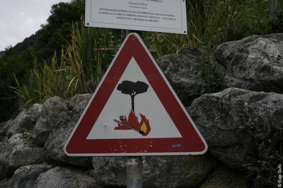 Il secondo cartello stradale che ho visto dal vivo per la prima volta nella vita proprio a Erve è quello di «pericolo incendio». Anche se a me viene da interpretarlo come «pericolo piromani»: infatti, gli incendi nel senso globale del termine possono capitare anche per motivi diversi da quello raffigurato.