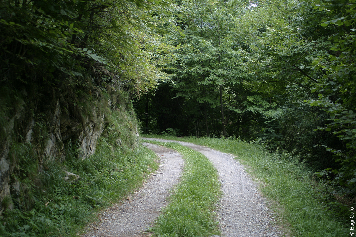 Camminando nella direzione indicata dal suddetto cartello, infatti, è sufficiente seguire sempre la strada più larga e logica: in poco tempo ci porta fuori da Erve, su una strada carrabile in mezzo al bosco (e non facciamoci ingannare da un cartello di testo che ai più dubbiosi potrebbe sembrare un divieto di accesso, in realtà non lo è). La pavimentazione stradale di questo percorso è molto varia – si alternano la terra e il cemento messo in modi diversi – ma sempre comoda per le salite e le discese a piedi. Se vi capiterà di incontrare una macchina, secondo me sarà un miracolo.