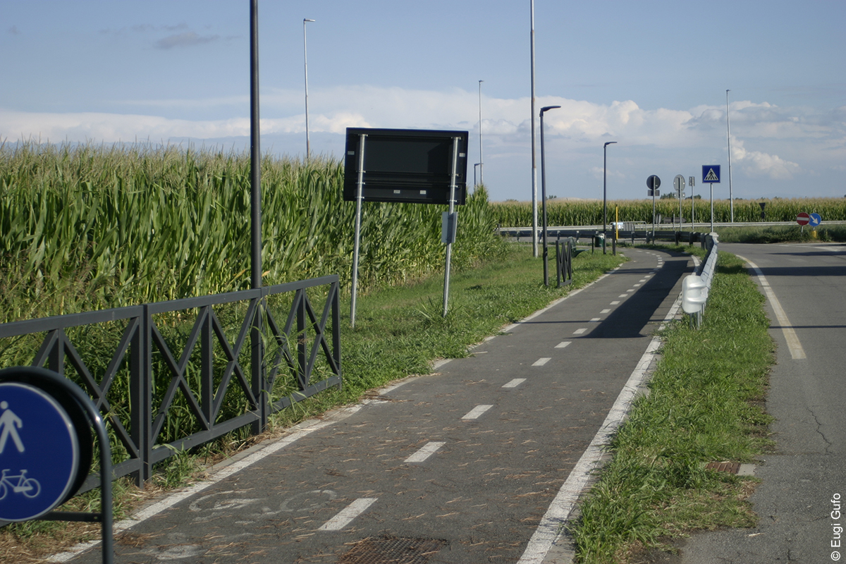 E poi serve almeno un modo di raggiungere altre località partendo dalla stazione e viceversa. In più, serve un modo di raggiungere anche lo stesso paese di Secugnago: perché, come scopriamo, la stazione ferroviaria – pur essendo circondata da alcuni edifici residenziali – è distante circa un chilometro dalla parte principale del paese. In mezzo, tra il paese e la stazione, ci sono i campi agricoli: per raggiungere il centro abitato principale bisogna camminare lungo una stradina asfaltata (quasi per nulla trafficata, ci passano solo le macchine di coloro che sono venuti a prendere qualcuno arrivato con il treno). Una volta giunti all’altezza del cimitero, bisogna andare a sinistra. A destra, invece, va la pista ciclopedonale «Marco Pantani» che porta non si capisce dove e che non sembra nemmeno tanto adatta alle corse di velocità.