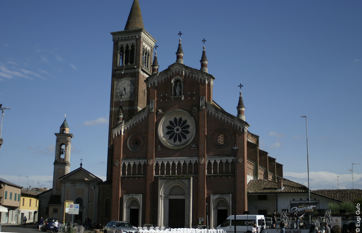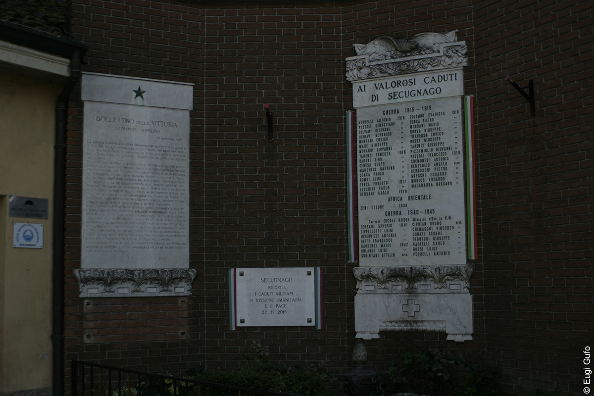 Ovviamente, nel pieno centro del paese non poteva mancare una chiesa. Anzi, a Secugnago sulla piazza centrale si affacciano ben due chiese costruite l’una accanto all’altra (a questo punto perché non di più?). Non sono riuscito a scoprire alcunché su quella più piccola a sinistra: nemmeno il nome. Sulla chiesa grande in mattoni, invece, posso dire che è dedicata a San Gaudenzio e che è stata costruita tra il 1927 e il 1928 sul posto di una chiesa demolita nel 1926.