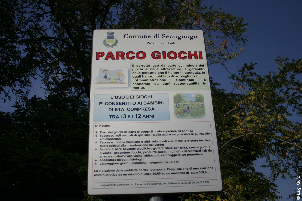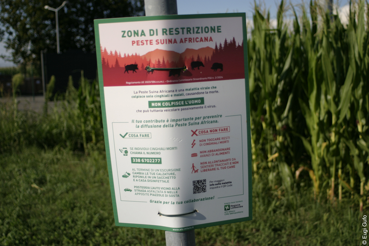Ma le persone realmente interessate ai percorsi del genere sapranno trovare tutte le informazioni necessarie anche con le proprie forze (io sono interessato solo ai sentieri di montagna). A Secugnago, intanto, ho avvistato un cartello di interesse più universale: le informazioni sulla diffusione della peste suina africana in zona. No, essa non colpisce gli umani. No, non ho visto dei cinghiali morti in giro. Forse sì: se l’umanità non avesse avuto l’esperienza del 2020, ora si sarebbero allarmati tutti.