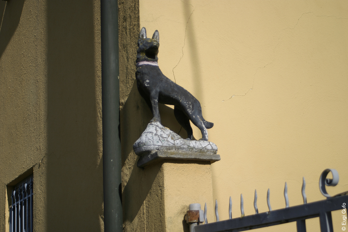 Ma è sicuramente da considerare un monumento privato questo cane che sostituisce il noiosissimo leone da cancello (sull’altra colonna c’è il secondo).