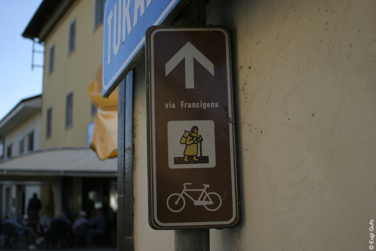 Un cartello a parte è quello che indica la misteriosa «via Francigena»: sarebbe un percorso di pellegrinaggio che porta dal nord della Francia fino a Roma, ufficialmente percorribile a piedi. Io l’ho sentito nominare in alcune occasioni e ho visto pure qualche cartello in giro… Ma non sono mai riuscito a capire il suo tracciato esatto, a meno che non coincida con le strade automobilistiche per dei tratti molto lunghi.
